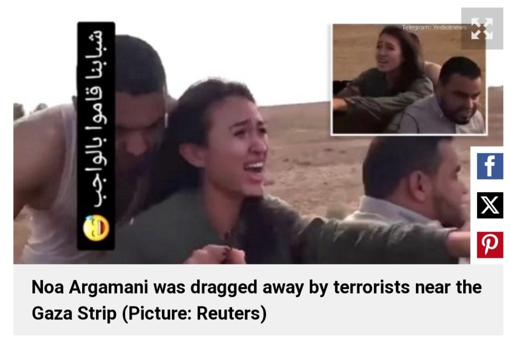 It has come to light that the men who abducted Noa Argamani were not Hamas members. They were Gazan civilians who followed Hamas through the gates on October 7 and blazed a trail through Israel, looting, killing and raping. And abducting pretty young girls as trophies. If you watch the videos, it is clear. These men do not wear hoods and their faces are clearly visible. They do not carry automatic weapons and ammunition belts. It is absolutely sickening and enraging. Nobody knows where they’re hiding Noa and what they’re doing to her. But somebody must know these men. Someone knows who they are and where they are keeping Noa and the other girls who have not been returned.