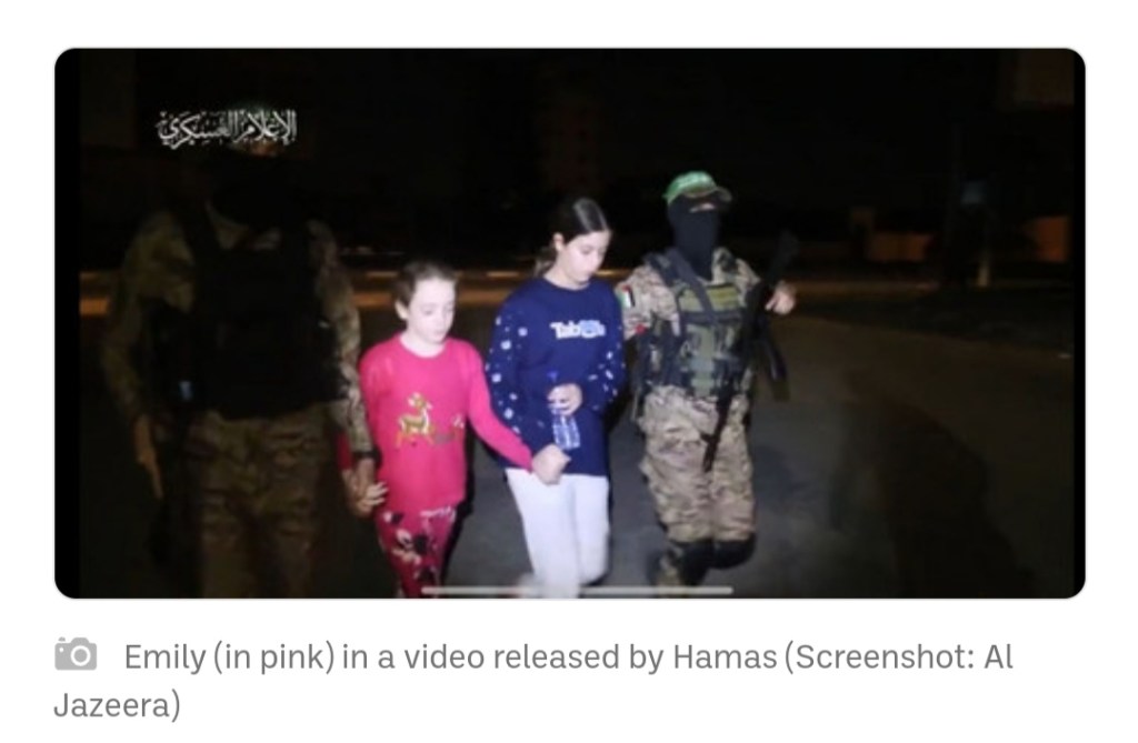 Emily was released together with her friend, Hila Rotem. The girls had clung together in the long weeks of captivity, under the care of Hila’s mother, Raaya. Raaya was not released that day, but fortunately, a few days later, she was. There was no rhyme or reason for that, apart from Hamas’ psychological warfare tactics – breaking up families and putting them through mental anguish is their favourite thing to do. Apart from causing death and destruction. They are Death Eaters.