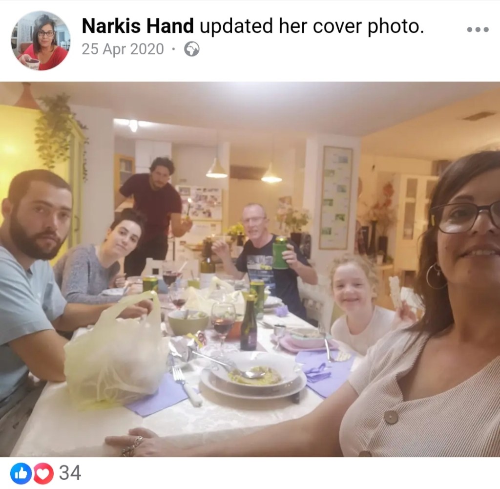 Emily is nine years old. She is the daughter of Thomas Hand, who is Irish and came to Israel as a kibbutz volunteer. Like I did. Thomas volunteered on kibbutz Be’eri and met a woman called Narkis, who he married and had two children with: Eden and Natali. The family lived in Be’eri. Later in life, when the children were teenagers, Thomas and Narkis divorced. Thomas met Liat Korenberg and they had a daughter together: Emily Tony Korenberg Hand. Sadly, Liat died of cancer when Emily was only two years old. So Emily lived alone with her father in kibbutz Be’eri. But she also spent a lot of time with Thomas’ ex-wife, Narkis, and her half-siblings, Eden and Natali. Narkis was like a mother to Emily. The family might have been unusual, but they were happy and close. This beautiful picture from Narkis’ facebook page shows that. In the photo, Narkis, Eden, Natali, Thomas and Emily are all sitting around the dinner table together. I can’t imagine a better way to be co-parents.