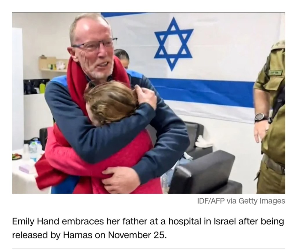 Then, after eight long weeks, a ceasefire was negotiated and an agreement was reached for some of the hostages to be freed. Emily was on the list but didn’t come home the first day. But finally, on November 25, after 49 days of captivity, Emily Hand was released into the embrace of her father.