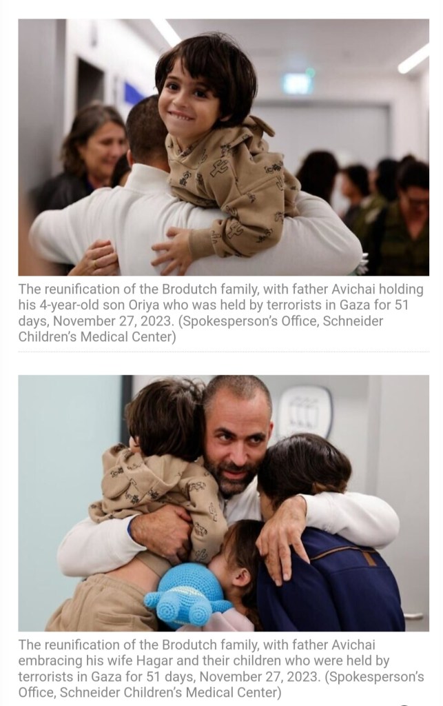Avigail and the Brodutches were in captivity for 50 days. Avigail turned four years old on November 24. US president Joe Biden took a specific interest in Avigail, because she has dual citizenship with ties to Arizona, and because of her status an an orphan. “What she endured is unthinkable,” he said.