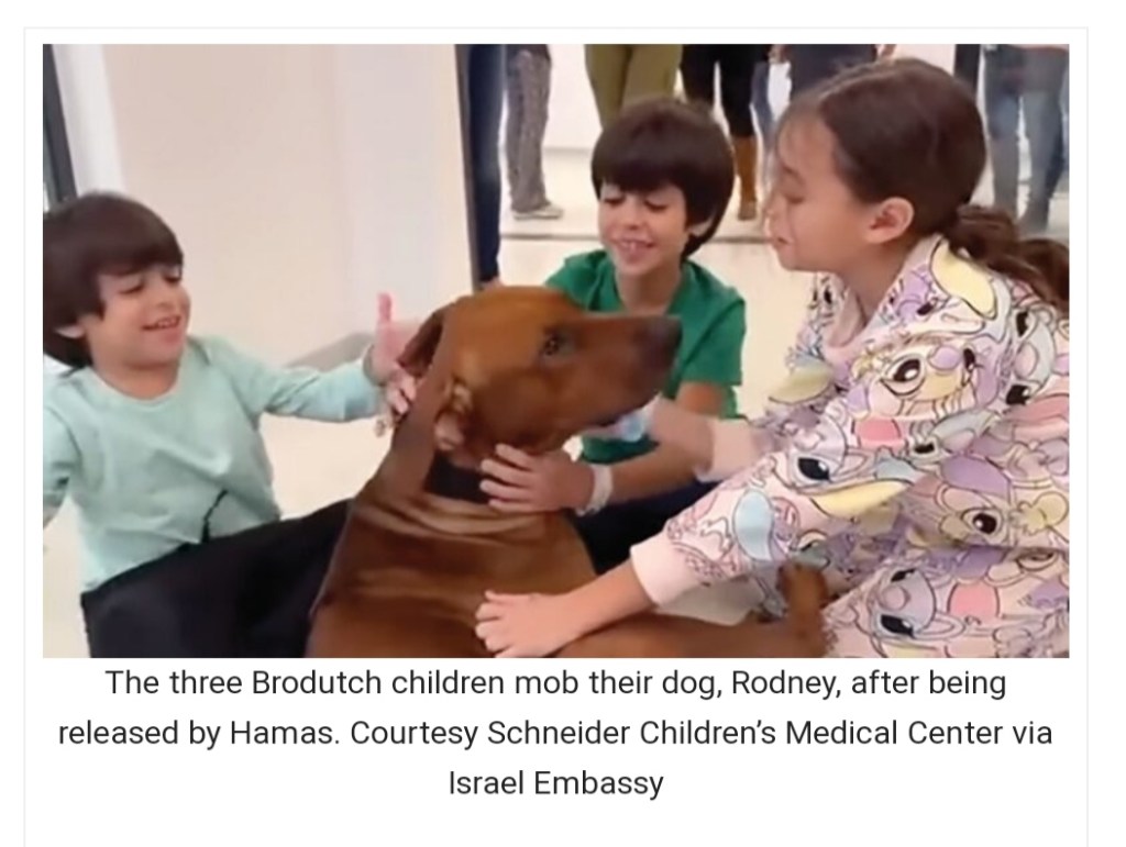 On November 26, the third day of the ceasefire, Avigail and the Brodutches were finally released. The reunion of Hagar and the children with their father and their dog was one of the most healing, wholesome things I have ever seen. Their joy made the whole country smile through their tears.