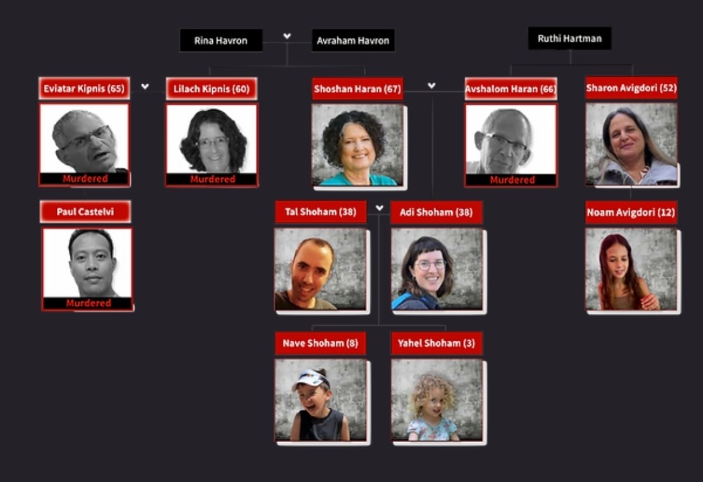Shoshan’s husband, Avshalom Haran, was murdered in cold blood. So were her sister, Lilach Kipnis, her husband, Eviatar Kipnis, and Eviatar’s caretaker, Paul Vincent Castelvi. And Shoshan was abducted, together with six other members of her family: her daughter Adi Shoham, Adi’s husband Tal Shoham, their children Yahel (3) and Naveh (8), Avshalom’s sister Sharon Avigdori and her daughter Noam. Eleven members of the same family (including Paul) were missing or dead. Try to imagine it. I can’t. My brain just refuses to wrap itself around this idea.