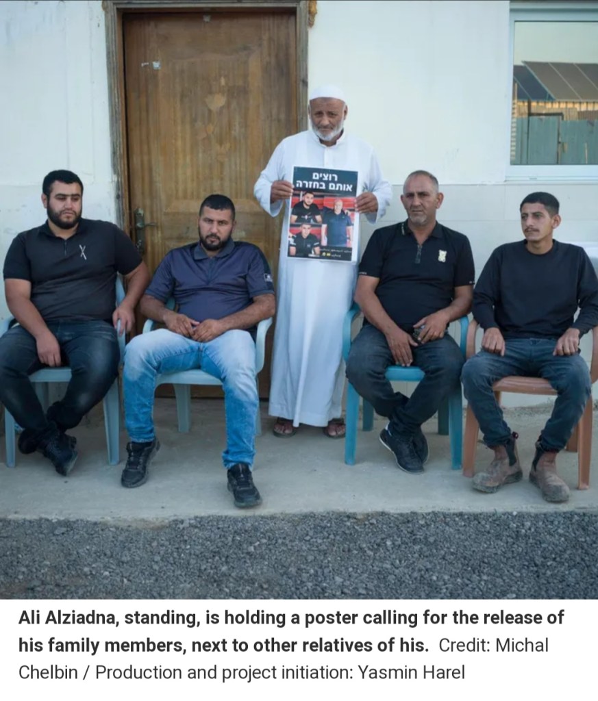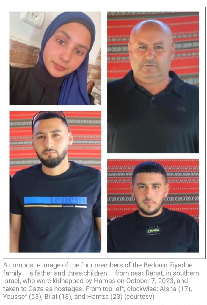 Four members of the same Bedouin family, the Alziadne clan, were abducted by Hamas. Youssef Alziadne has worked in the dairy farm of kibbutz Holit for seventeen years. When they were old enough, three of his children, Hamza, Bilal and Aisha, starting working with him. On October 7, they were all at work when the terrorists invaded kibbutz Holit. At the end of the day, all four were marked as missing. Later, they were seen in security footage, being led into Gaza on foot. Their status was adjusted to hostages.