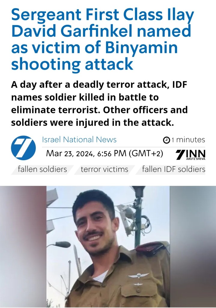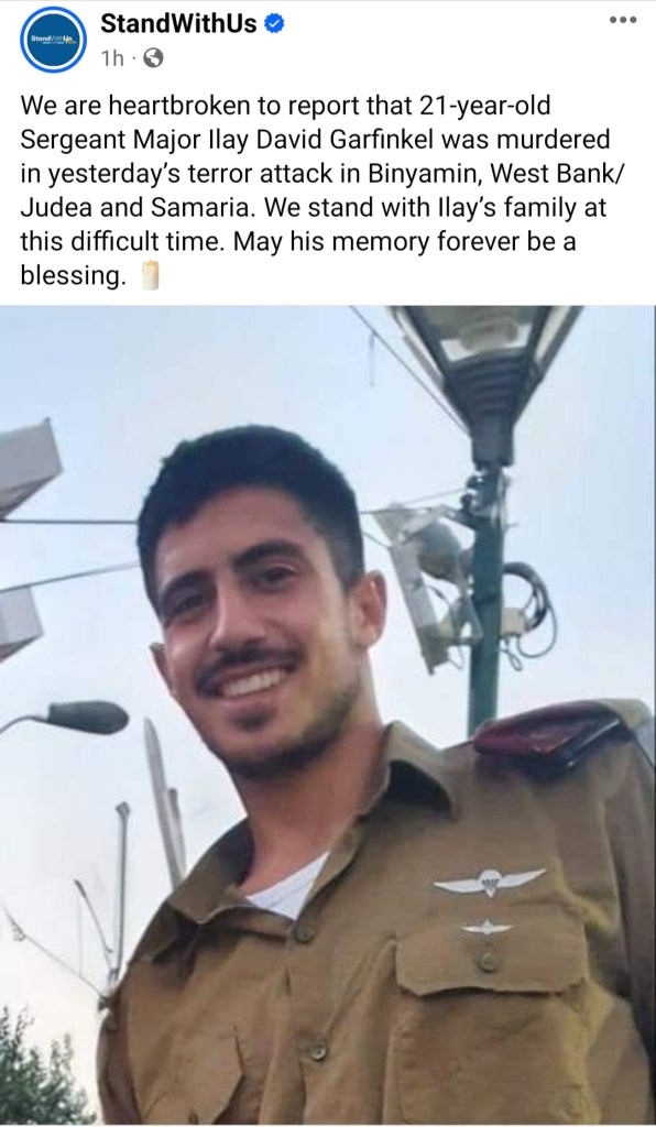 The oldest son of our friend and neighbour, Shirley Garfinkel, was killed in a terror attack in the West Bank on March 22. His name was Ilay Garfinkel and he was 21 years old.
